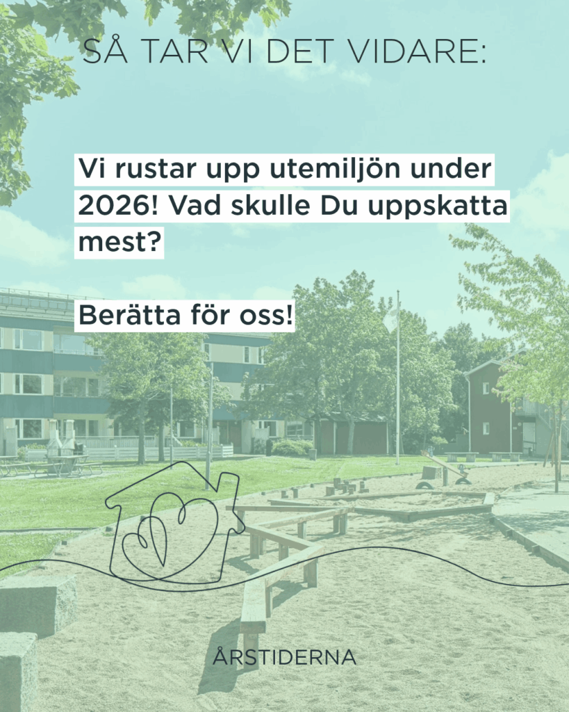 Under 2026 planerar vi generella upprustningar av utemiljön på Årstiderna. För att göra insatser som verkligen märks i vardagen vill vi gärna veta vad ni som bor här skulle uppskatta mest.