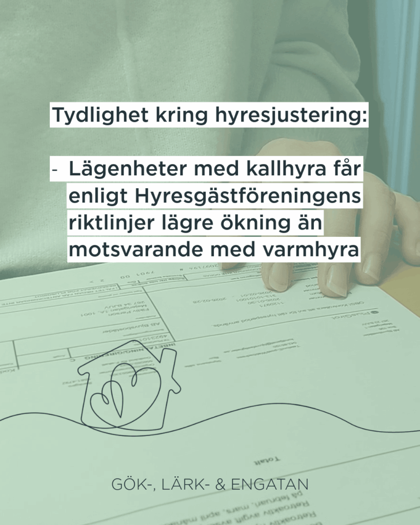 - Enligt Hyresgästföreningens riktlinjer görs skillnad på hyresjusteringen beroende på om lägenheten har kall- eller varmhyra, så att kallhyra får en lägre ökning.