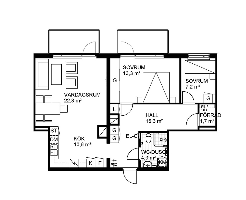 - Samtliga lägenheter har egen balkong med belysning och eluttag.