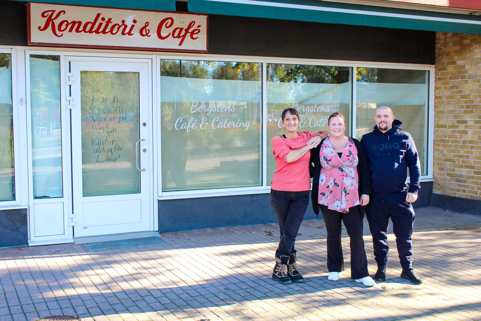 Receptionsentre till Bjuvsfastigheter, penseer i förgrunden, skylt välkommen på invigning 9 oktober