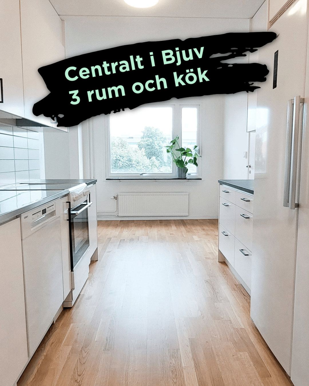 Blommor framför Bjuvsfastigheters fasad och text om Semesterbemanning